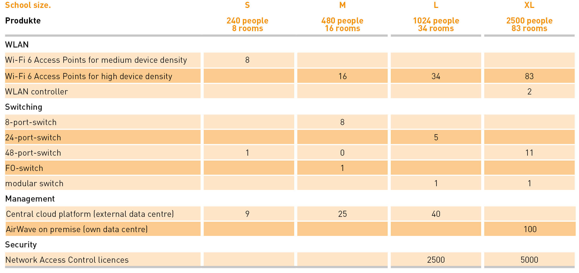 The concept is made up of access points, switches and the necessary management licences—which can be located in the cloud, an external or on-premise data centre, and, from a certain school size upwards, includes a network access control solution, which is used to grant permissions to students and teachers in the network. Using these tables, you can get a picture of the amount of devices and licences you need for your project. We also recommend purchasing 3 years of support. Bechtle will take care of configuration. If you wish, we can offer you several extras.