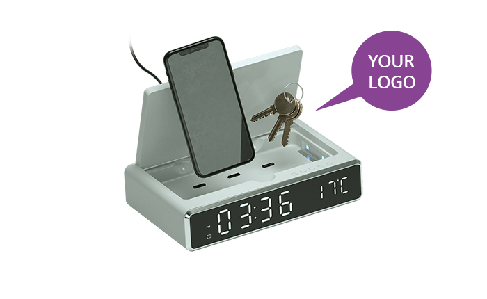 A versatile wireless charger with a built-in alarm clock and UV-C steriliser that can disinfect smartphones, keys, masks, toothbrushes, scissors and much more.