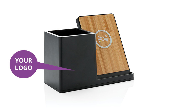 Wireless10 W fast charger with pen holder made of Recycled Claim Standard-certified recycled ABS.