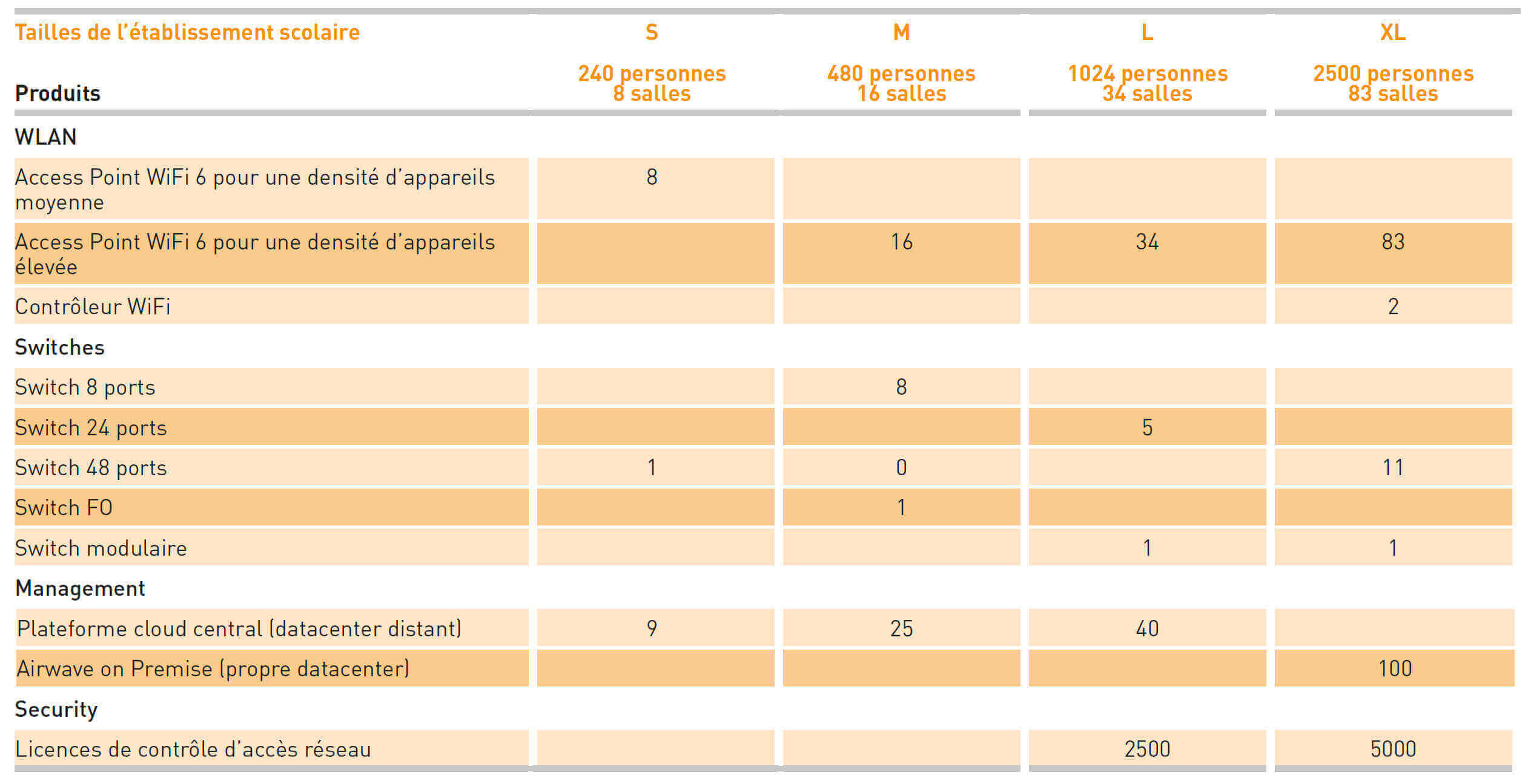 Utilisez le tableau ci-dessous pour déterminer le nombre d’appareils et de licences requis en fonction de la taille de votre établissement scolaire pour votre solution Aruba.