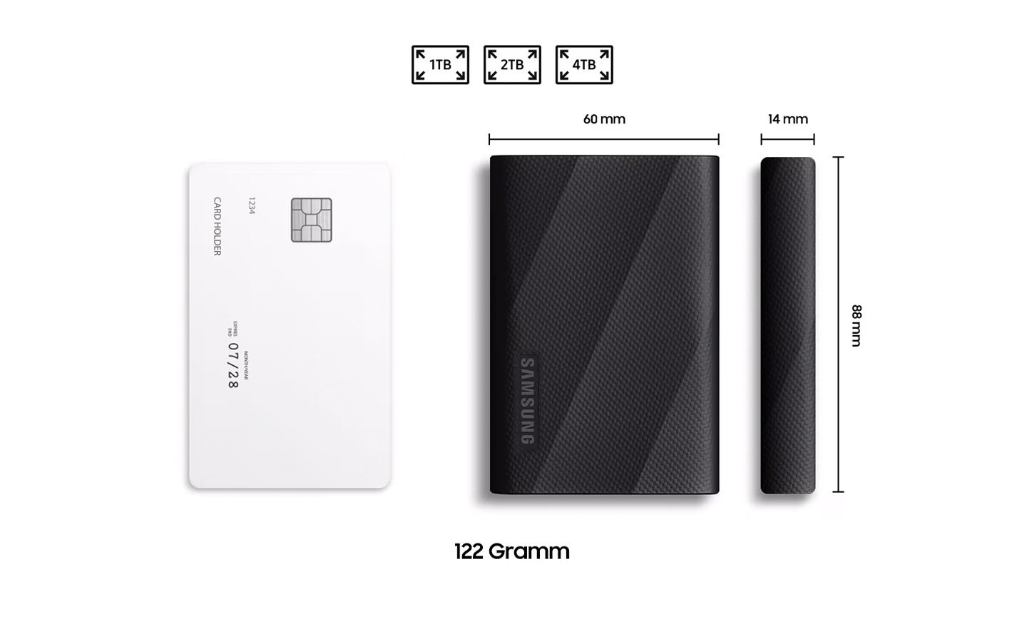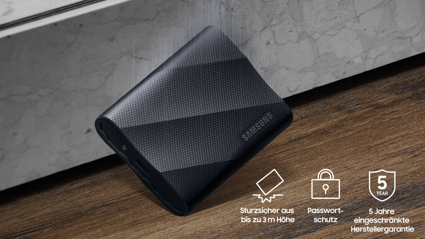 Ausgestattet mit dem Dynamic Thermal Guard von Samsung kann die PSSD T9 potenzielle Leistungseinbussen durch Überhitzung reduzieren und für hohe Übertragungsgeschwindigkeiten sorgen. Darüber hinaus entspricht sie der internationalen Sicherheitsnorm IEC 62368-1 und bietet damit ein zusätzliches Mass an Zuverlässigkeit und Sicherheit.