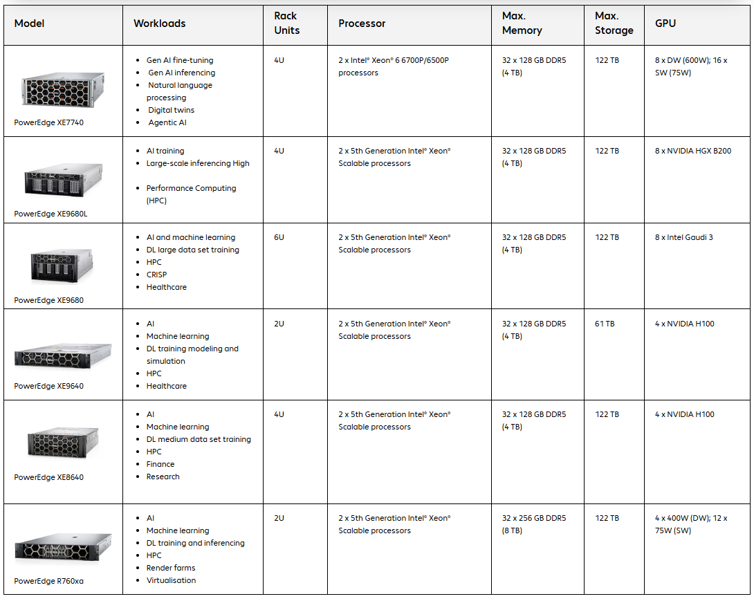 PowerEdge XE servers are acceleration-optimised, purpose-built for artificial intelligence (AI), generative AI (GenAI), and high performance computing (HPC). With superior acceleration and diverse GPU options, these powerful platforms are optimised to turn ideas into action faster.