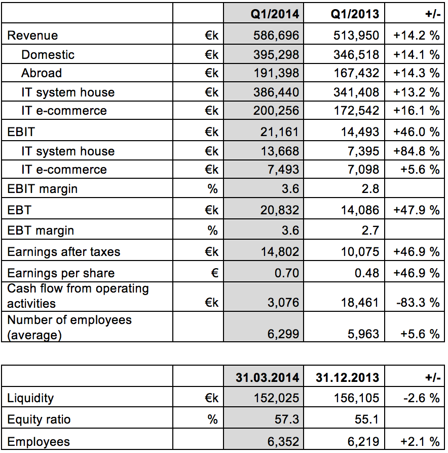 In the first quarter, the IT system house & managed services segment managed to increase its revenue 13.2 per cent to €386.4 million (prior year: €341.4 million). The domestic system houses served as the growth driver, stepping up their contribution to the group revenue by 14.6 per cent to €338.8 million (prior year: €295.7 million). In the first quarter of 2014, the segment EBIT went up by a remarkable 84.8 per cent to €13.7 million (prior year: €7.4 million). At 3.5 per cent, the EBIT margin was significantly higher than in the prior year (2.2 per cent). Among other things, this excellent development is the result of the higher service share and the disproportionately low increase in personnel expenses.