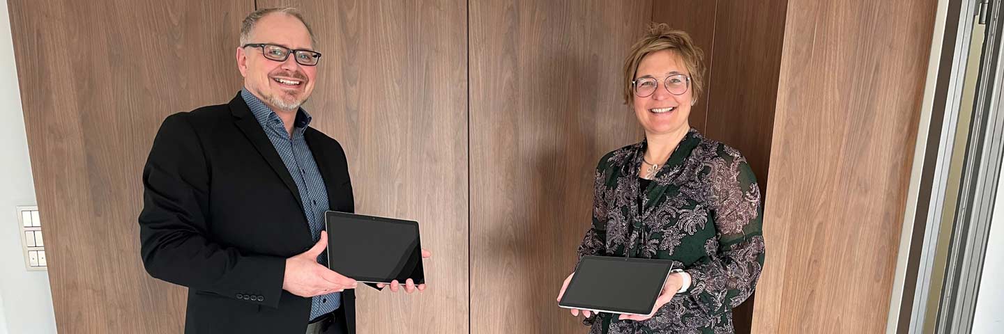 Device handover and setup took place on 28 February 2022, with Mayor Heike Schokatz and Head of Office Oliver Schölzel were there to gratefully receive the donations. The Horneck school just needed to connect the tablets—operating on Windows—up to their paedML® to start using it for the secondary school. The Horneck school also received two tablet cases to charge and transport the Surfaces to the classrooms.