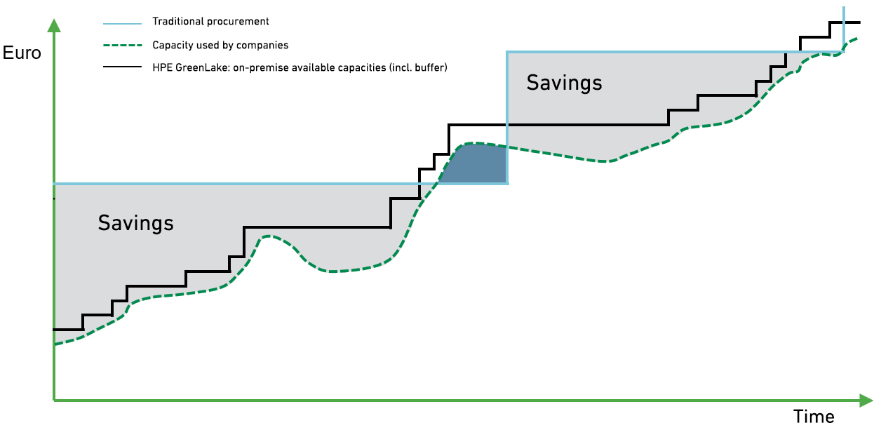 Over-provisioning can lead to unnecessary costs for businesses as they are unable to precisely estimate their needs in advance. With HPE GreenLake, you only pay for what you use, just as you would for electricity! And if you need to increase capacities at short notice, it’s possible within minutes, not months, with HPE GreenLake. This helps you avoid protracted procurement processes, provisioning times and frustrating bottlenecks. Not to mention the investment costs.