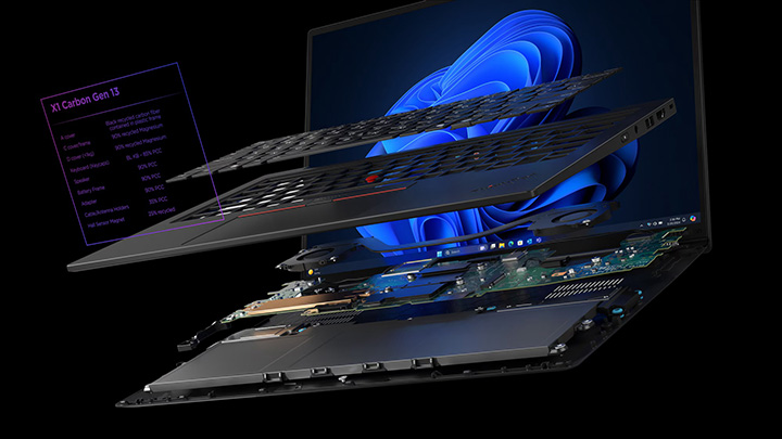 The Lenovo ThinkPad X1 Carbon Gen 12 (14" Intel) laptop still uses carbon fibre for the chassis—but better yet some of that carbon fibre is recycled from post-industrial remnants and is used along with 90% recycled magnesium. Plus, the chassis, the battery pack, the speaker enclosure, and the power adapter all include recycled post-consumer content. And that’s not all. The packaging is 100% plastic-free and comprised in part of rapid-renewable materials made from bamboo-sugar-cane fibre.