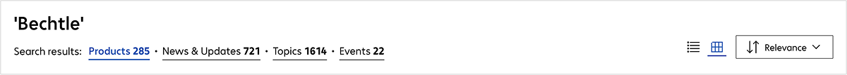 Below the search term, buttons for Products, Press & News, Topic Pages and Events appear. These categories are automatically shown or hidden depending on whether there are any results for the current search term. The number next to each one indicates how many results are available. Each category offers its own filtering and sorting options, thereby clearly distinguishing between products and editorial content. This allows you to maintain an overview at all times, even with extensive search queries, and quickly navigate to the relevant content section.
