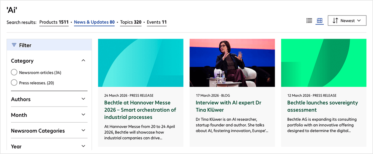 If press releases or newsroom articles are found for a search term, the "Press & News" button appears on the search results page. The corresponding tiles in this section display the title, publication date, teaser text and a preview image, providing a quick overview of relevant content. Using the filters for category, year and month, you can narrow down the results precisely, allowing you to find important company announcements or industry news with ease.