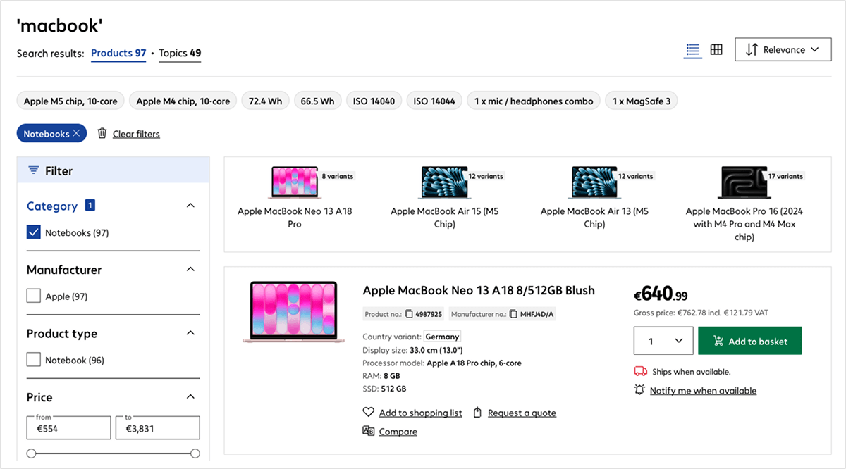 Despite this common structure, the tiles differ in detail depending on the product type. Merchandise displays specific technical features such as screen size, processor or memory specifications. The item number and manufacturer’s number are prominently displayed beneath the title. On the right are the net and gross prices, quantity selection, the ‘Add to basket’ button, delivery information and actions such as ‘Save’, ‘Request a quote’ or ‘Compare’.