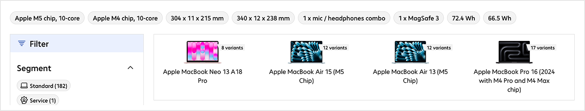 The filter chips display key features of the products found, such as processor variants, dimensions or technical specifications. Clicking on a chip immediately applies the corresponding filter in the left-hand filter bar and narrows down the results list.