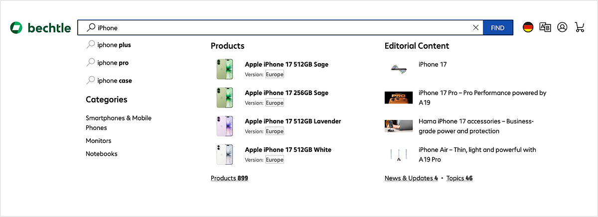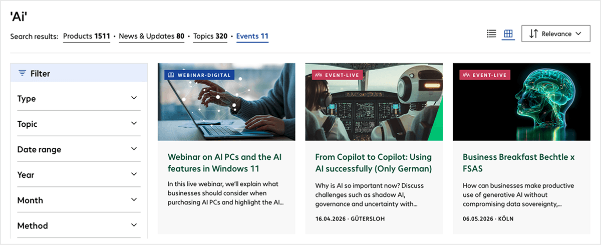 The search function on bechtle.com is the central hub for quickly finding hardware products, software licences, cloud solutions, services, training courses, and editorial content such as press releases, newsroom articles, customer case studies, topic pages and events. It enables consistent, customer-specific access to all content via a single interface.
