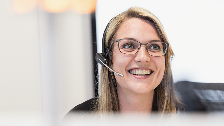 Eine Mitarbeiterin sitzt am Tisch mit dem Headset auf dem Kopf und spricht