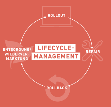 - Übernahme des vollständigen Lifecycle-Managements (Rollout/ Repair/Rollback/Entsorgung oder
