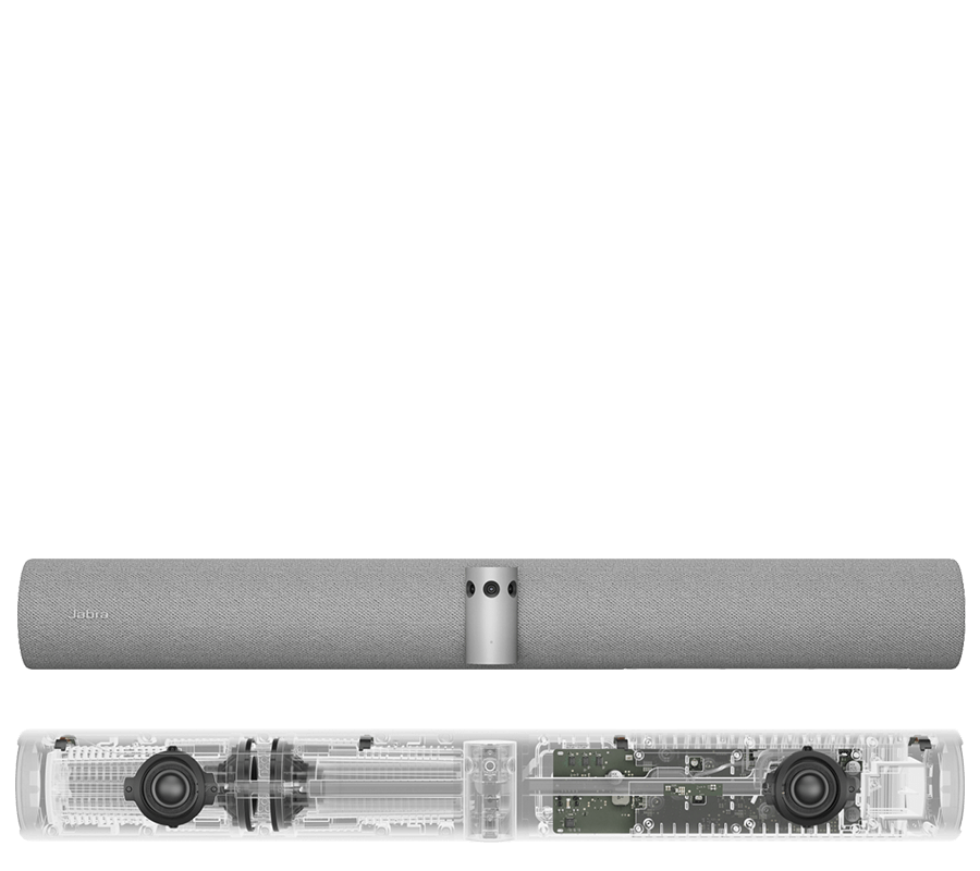 Vier leistungsstarke, speziell von Jabra entwickelte Lautsprecher – zwei 50-mm-Tieftöner und zwei 20-mm-Hochtöner – bieten erstklassigen HD-Stereo-Sound im ganzen Raum. Zusätzlich hat Jabra sie in einer vibrationsneutralisierenden Anordnung verbaut. Die innovative Vollduplex-Audiotechnologie überträgt Gespräche sehr viel natürlicher.