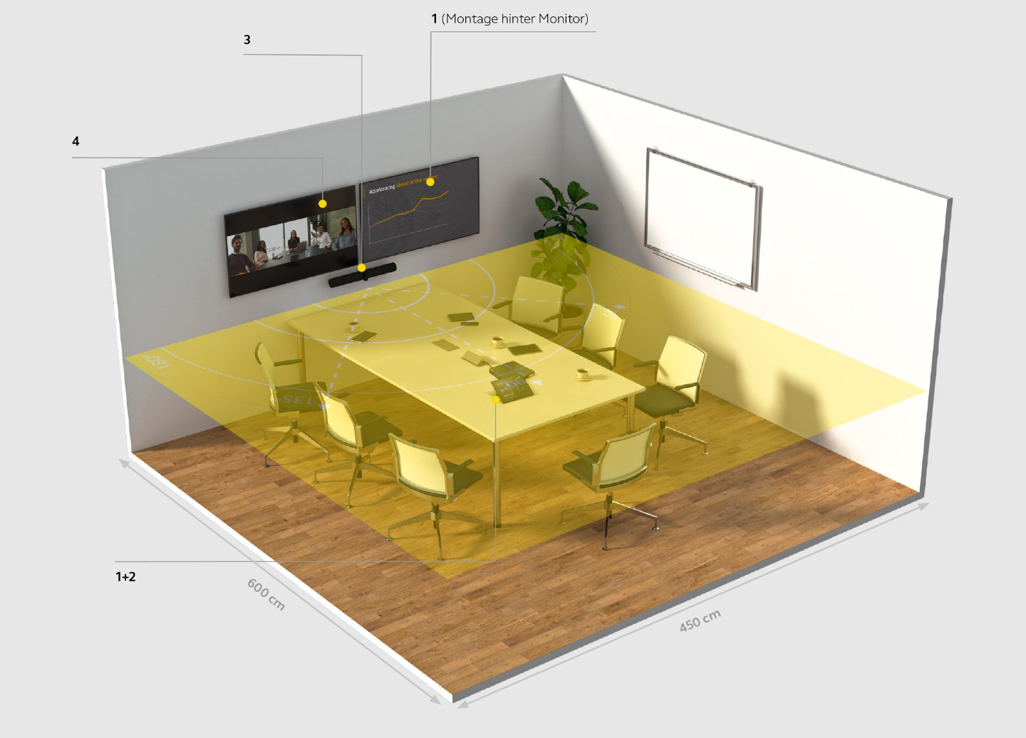 Jabra PanaCast 50-Platzierung unter den Bildschirmen: 90 - 110 cm (idealerweise 100 cm) vom Boden aus..