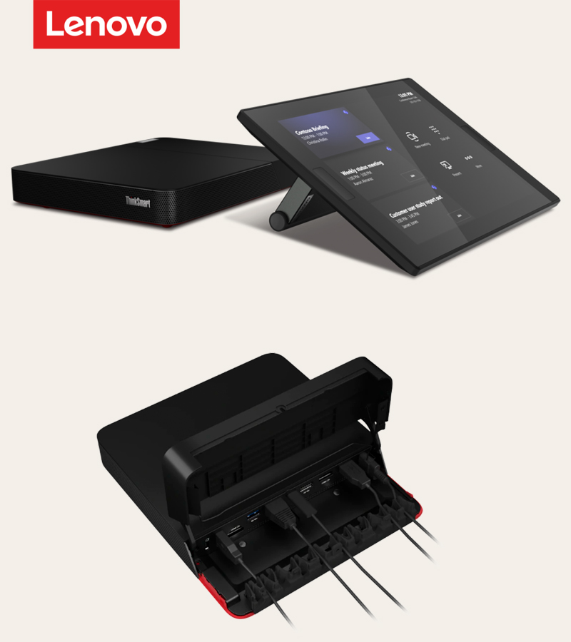 - Der Lenovo ThinkSmart Controller steuert die Kommunikationslösung und bietet die vertraute Benutzeroberfläche von Microsoft Teams Rooms, über die Mitarbeitende vor Ort ganz einfach mit ortsunabhängig tätigen Kolleg:innen zusammenarbeiten können.