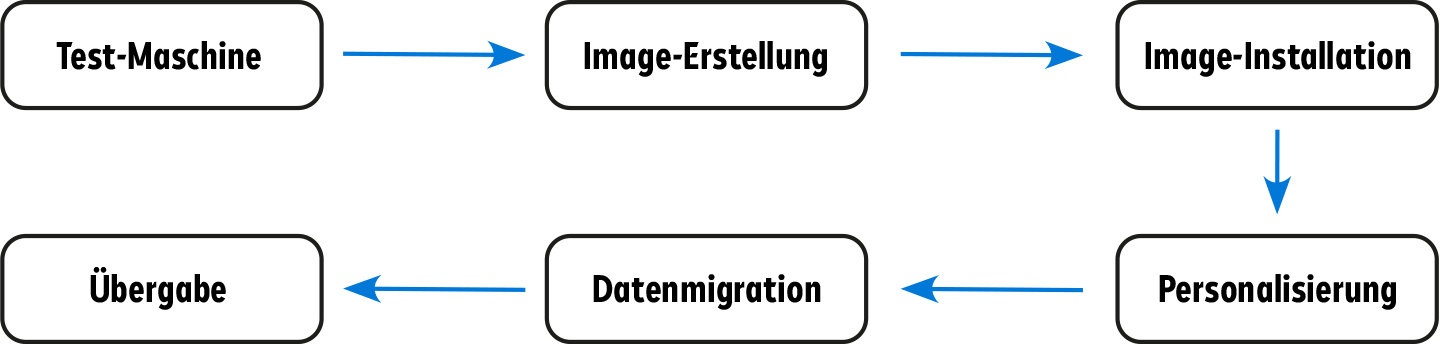Dabei werden die Rechner ausgepackt und in das Client Management Tool, in der Regel Microsoft System Center Configuration Manager, aufgenommen. Danach werden die Computer in der Installationsstraße aufgebaut und dann mit dem zuvor erstellten Custom Image provisioniert. Nach dem Betankungsvorgang wird dann das Gerät abgebaut. Schlussendlich muss das Gerät dann noch am jeweiligen Arbeitsplatz der Mitarbeiterin oder des Mitarbeiters aufgebaut werden. Dieser gesamte Einrichtungsprozess, von der Erstellung des Images bis zum Aufbau am Arbeitsplatz, nimmt sehr viel Zeit Anspruch.