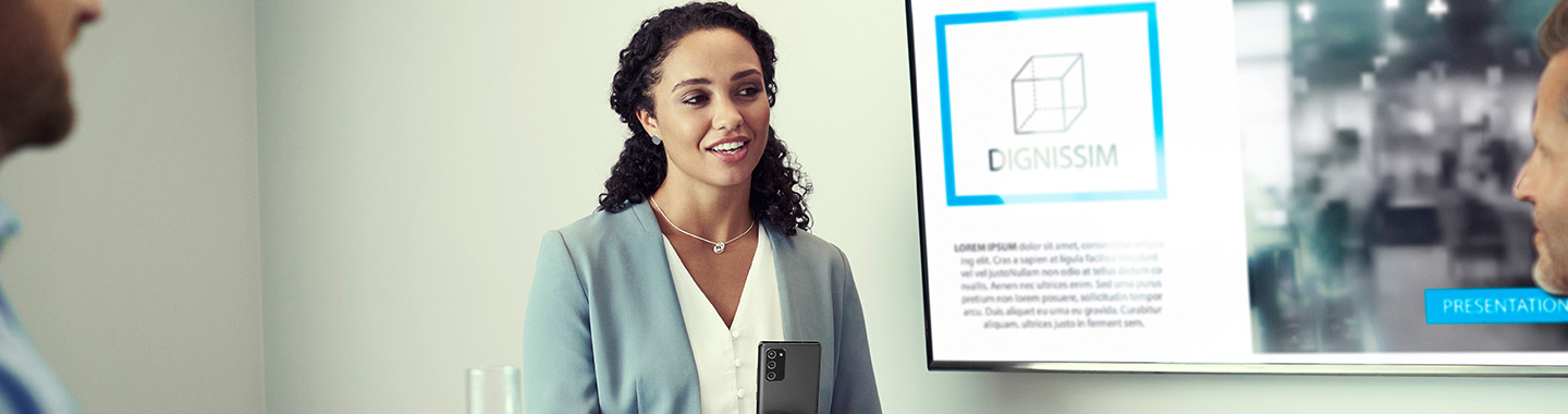 DeX stands for Desktop eXperience and lets you use your tablet or smartphone as a desktop. While private users can make use of it too, it was developed primarily for business. Send messages to colleagues, watch a webinar on a large screen, and prepare for your big presentation—all with a single Galaxy device that supports DeX. It makes managing your calender and creating and checking documents and e-mails simple, and boosts employee productivity and multitasking with a wireless connection.
