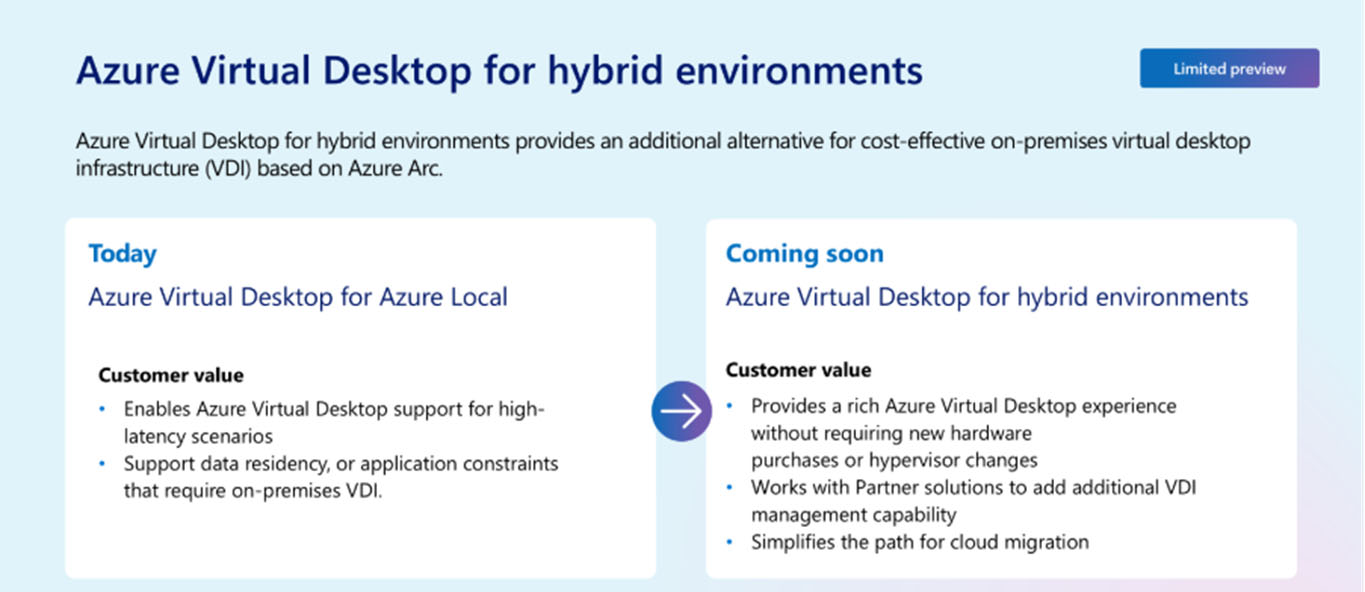 Nieuw in Azure Virtual Desktop: Hybride Azure Virtual Desktop ondersteunt on-premises omgevingen via Azure Arc, waardoor er virtuele desktops kunnen draaien zonder de bestaande infrastructuur te vervangen. Dit is alleen van toepassing op Windows 11 Enterprise en Windows Server.