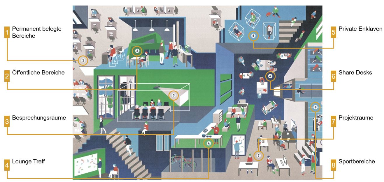 - Mitarbeitende erhalten Freiräume. Unternehmen können dank moderner Arbeitsplatzkonzepte besser auf die Mitarbeitenden eingehen – indem verschiedene Arbeitsplätze für unterschiedliche Arbeitsweisen zur Verfügung gestellt werden. So können Firmen Zonen einrichten, in denen ungestörtes Arbeiten möglich ist. In anderen Bereichen treffen sich Projektteams zum Austausch in einer größeren Gruppe oder zur Absprache im Tandem.