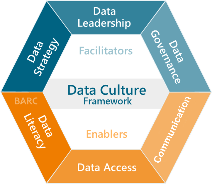 Die unteren drei Komponenten bezeichnet BARC als „Enablers“. Sie beziehen sich auf Prozesse rund um die Arbeit mit Daten. Mit Data Access ist die unternehmensweite Datenverfügbarkeit gemeint, die sicherstellt, dass jedem Mitarbeitenden alle Daten zur Verfügung stehen, die er für seine Arbeit benötigt. Data Literacy ist die Datenkompetenz, die bei jedem Mitarbeitenden zur produktiven Datenarbeit vorausgesetzt wird. Und Data Communication bezieht sich auf die datengestützte Kommunikation und Argumentation in Meetings sowie auf die datenbasierte Begründung von Entscheidungen. Diese drei Komponenten bilden zugleich den Nährboden, auf dem eine effiziente Datenkultur entstehen und gedeihen kann.