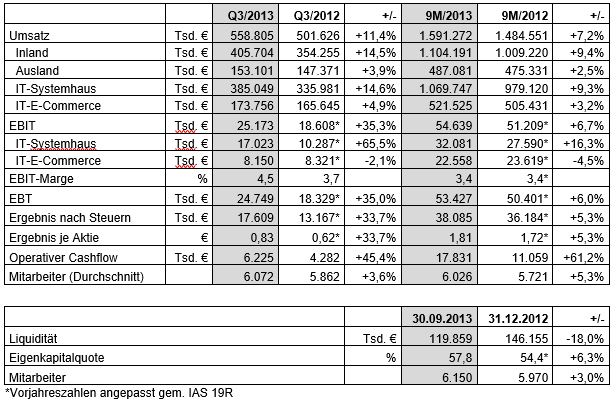Das Segment IT-Systemhaus & Managed Services konnte im dritten Quartal überdurchschnittlich zum Wachstum beitragen. Der Umsatz lag mit 385,0 Mio. € um 14,6% über dem Vorjahresquartal (336,0 Mio. €). Wachstumsmotor waren die inländischen Systemhäuser, die ihren Beitrag zum Konzernumsatz um 16,7% auf 348,2 Mio. € erhöhten (Vorjahr: 298,4 Mio. €). Das Betriebsergebnis im Segment stieg im dritten Quartal 2013 um 65,5% auf 17,0 Mio. € (Vorjahr: 10,3 Mio. €). Die EBIT-Marge liegt mit 4,4% deutlich über dem Vorjahr (3,1%). Zurückzuführen ist diese Entwicklung unter anderem auf den gestiegenen Anteil höherwertiger Dienstleistungen.