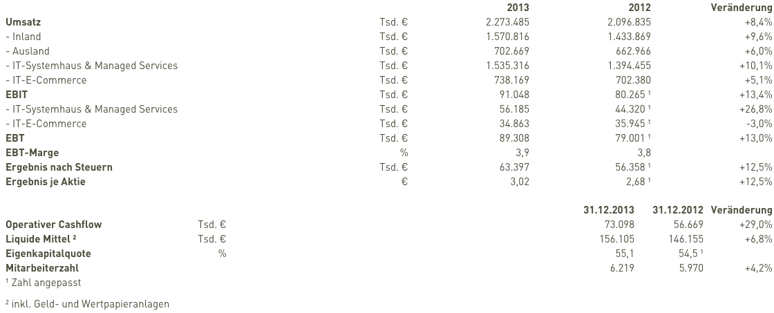 Im Segment IT-Systemhaus & Managed Services erzielte der Konzern 2013 einen Umsatz von 1.535,3 Mio. € (Vorjahr: 1.394,5 Mio. €). Das entspricht einer Steigerung von 10,1 %. Das Segment hat dabei von der hohen Nachfrage im Inland, der guten Wettbewerbsposition und dem Beschäftigungszuwachs sowie den umfangreichen Qualifizierungsmaßnahmen profitiert. Die inländischen Systemhausgesellschaften konnten mit einem Umsatzwachstum von 11,0 % ihren Marktanteil deutlich ausbauen. Das EBIT wuchs im Systemhaussegment um 26,8 % auf 56,2 Mio. € (Vorjahr: 44,3 Mio. €). Die EBIT-Marge erhöht sich folglich von 3,2 % auf 3,7 %.