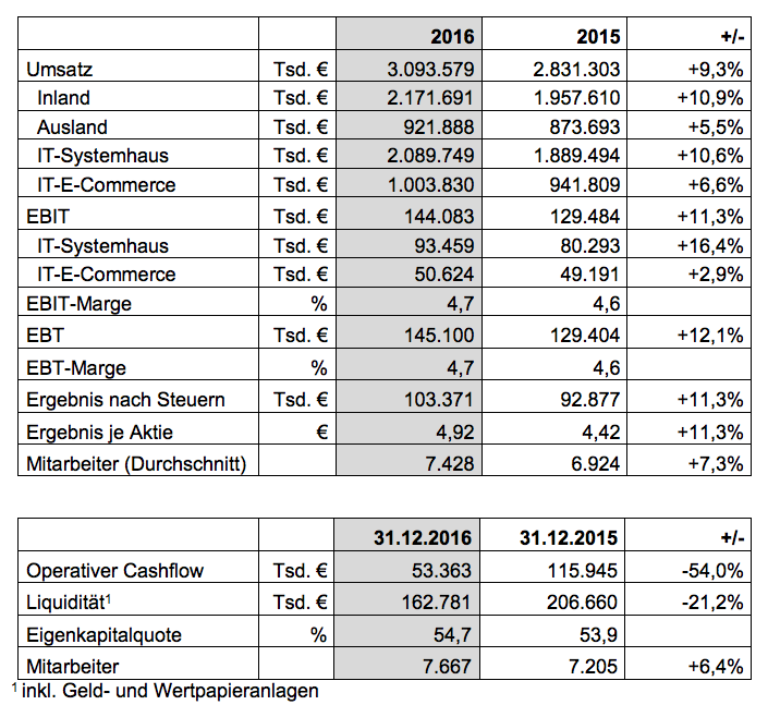 Neckarsulm, 16. März 2017 – Die Bechtle AG ist im Geschäftsjahr 2016 wieder sehr dynamisch gewachsen. Der Umsatz stieg um 9,3% und hat mit 3.093,6 Mio. € erstmals die Marke von 3 Milliarden € überschritten. Bemerkenswert war dabei das Wachstumstempo im vierten Quartal: Trotz der hohen Vergleichsbasis des sehr guten Vorjahresquartals konnte Bechtle zum Jahresende den Umsatz um 11,8 % erhöhen. Das Vorsteuerergebnis (EBT) stieg im Gesamtjahr um über 12 % auf 145,1 Mio. €. Die EBT-Marge liegt damit bei sehr guten 4,7 %. Zum Jahresende waren 7.667 Mitarbeiter bei Bechtle beschäftigt. Das sind 6,4 % mehr als im Vorjahr. Die Dividende soll das siebte Jahr in Folge erhöht werden und auf 1,50 € (Vorjahr: 1,40 €) steigen.