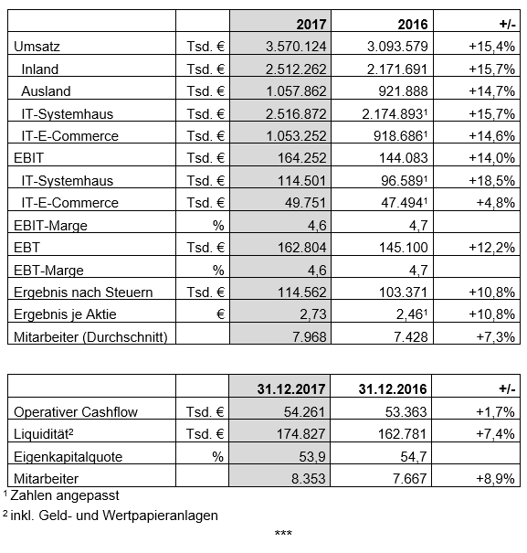 Das Segment IT-E-Commerce wuchs 2017 rein organisch um 14,6 % auf 1.053,3 Mio. €. Besonders stark war das Wachstum im Inland mit einem Plus von 19,2 % auf 307,5 Mio. €. Aber auch die ausländischen Gesellschaften konnten mit 12,9 % zweistellig zulegen. Die Nachfrage war am höchsten bei mobilen Endgeräten sowie Monitoren und Servern. Das EBIT stieg um 4,8 % auf 49,8 Mio. € (Vorjahr: 47,5 Mio. €). Die EBIT-Marge liegt bei 4,7 %. Hintergrund für den leichten Margenrückgang ist unter anderem ein positiver Einmaleffekt in Höhe von rund 2 Mio. € im Vorjahr.